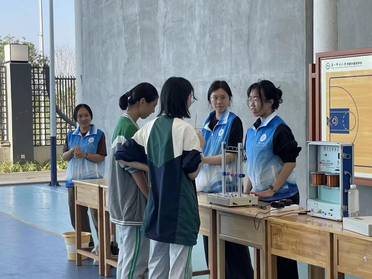 本次活动采用室外科普摆摊形式,设置了多个互动体验与科学演示区域。现场展出涵盖力学、光学、电磁学等领域的十余项科普装置,通过沉浸式、互动式的体验模式,让学生们在动手实践中感受科学魅力。志愿者们用通俗易懂的语言讲解科学原理,引导学生观察现象、思考原理,将抽象知识与实践操作有机结合。