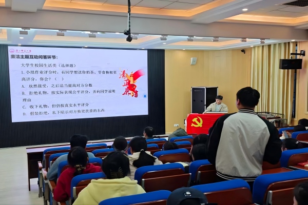 活动围绕“理论领学、警示教育、文化浸润、实践互动”展开。首先,主持人以廉洁教育对青年党员成长的重要性为切入点,点明廉洁自律是青年党员个人成长道路上的“必修课”。随后,组织党员集中观看桂林市反腐倡廉教育警示视频,以本土案例强化“知敬畏、存戒惧、守底线”的行动自觉。紧接着,活动进入“廉洁古诗品鉴”环节,以“粉身碎骨全不怕,要留清白在人间”的经典诗句为引,深入剖析其中“坚守清白”的精神内核,传递廉洁价值理念,让廉洁文化真正融入党员的思想认知。最后,活动结合小组作业评分、班干竞选等校园日常场景,设计了趣味廉洁互动问答环节。党员们现场交流思路、分享见解,在贴近生活的情境中深化了对廉洁处事的理解与认知。
