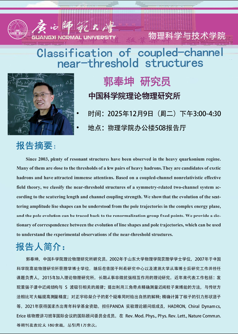【科研活动月学术预告】郭奉坤(中国科学院理论物理研究所):Classification of coupled-channel near-threshold structures