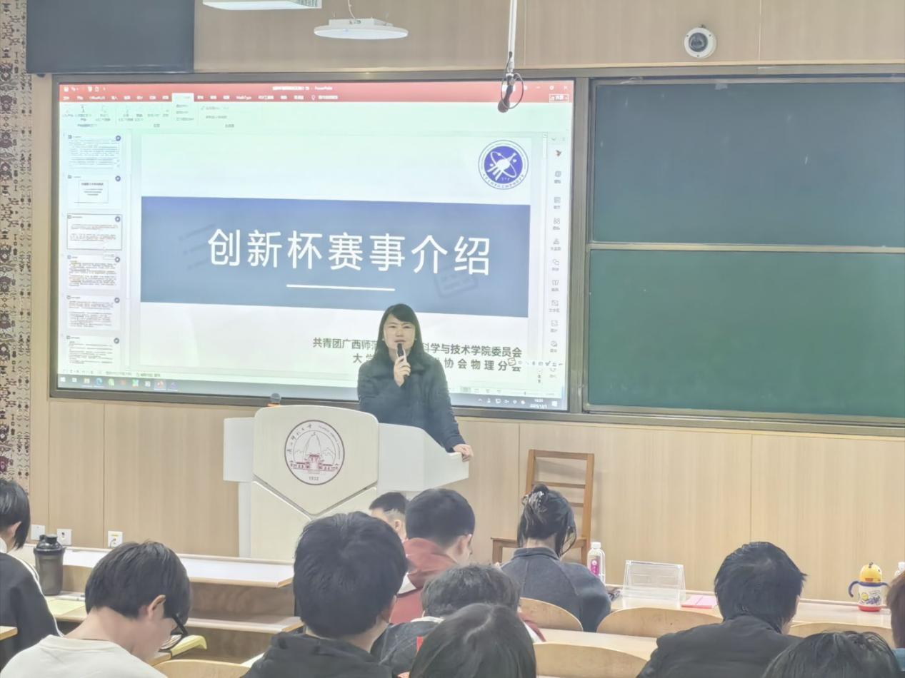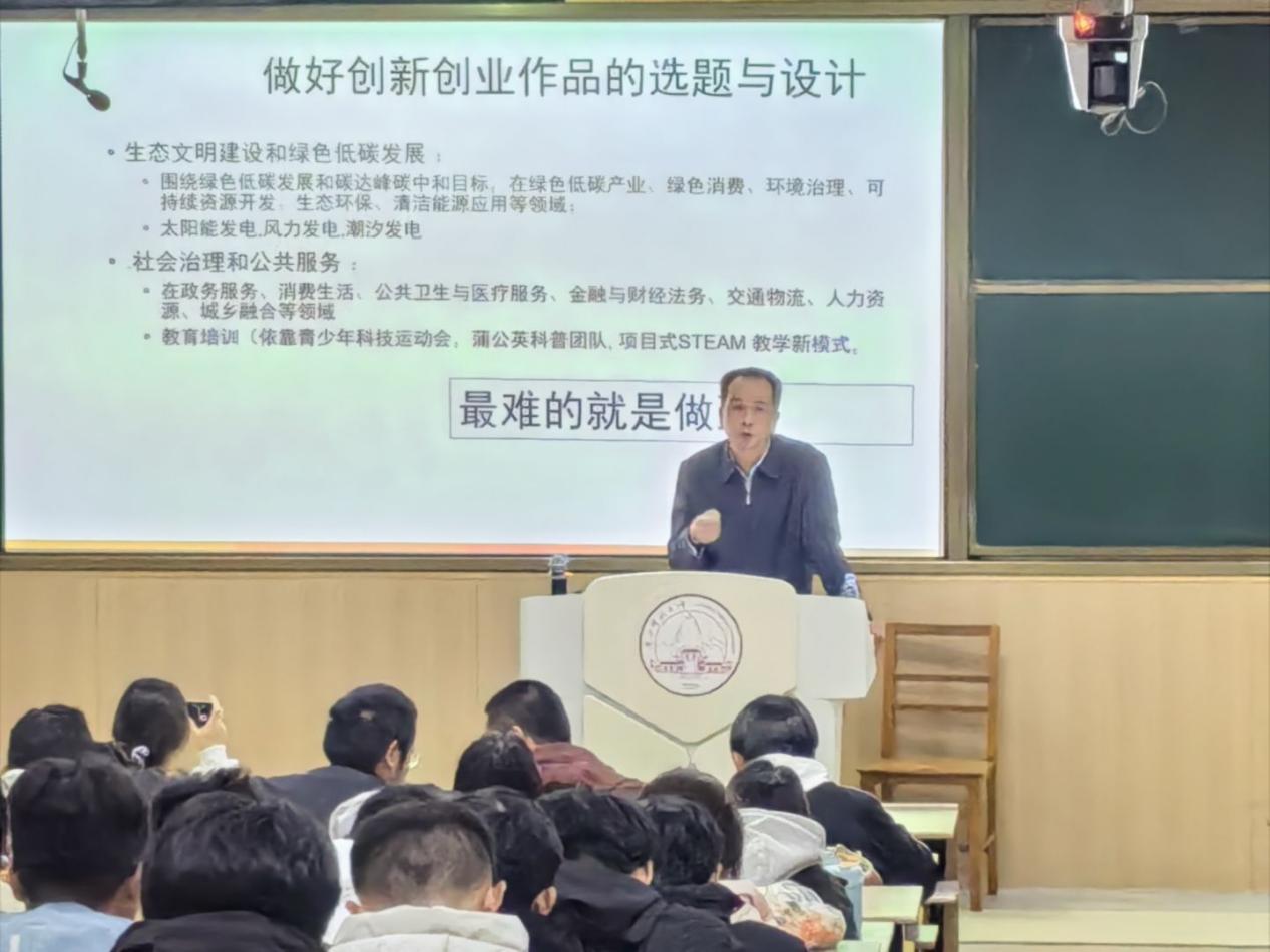 会上,科协负责人首先系统解读了本届赛事的章程、分类、流程与评审要求,为同学们明确了参赛路径。随后,潘福东老师作专题指导,围绕“如何培育有价值的创新项目”这一主题,重点讲解了从科学前沿与社会需求中寻找选题、构建技术路线、展示研究成果等关键环节。他鼓励同学们夯实专业基础,勇于探索交叉领域。