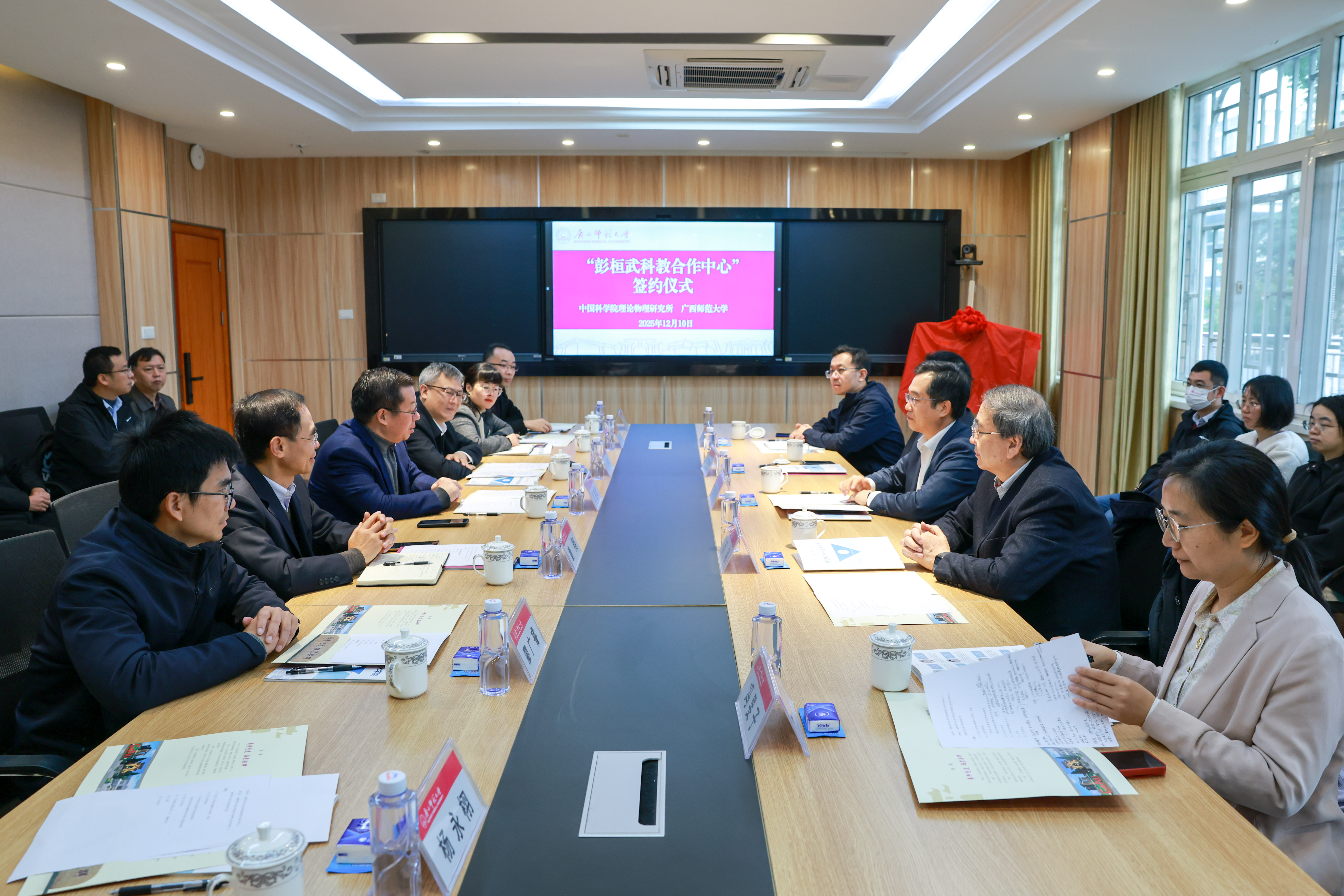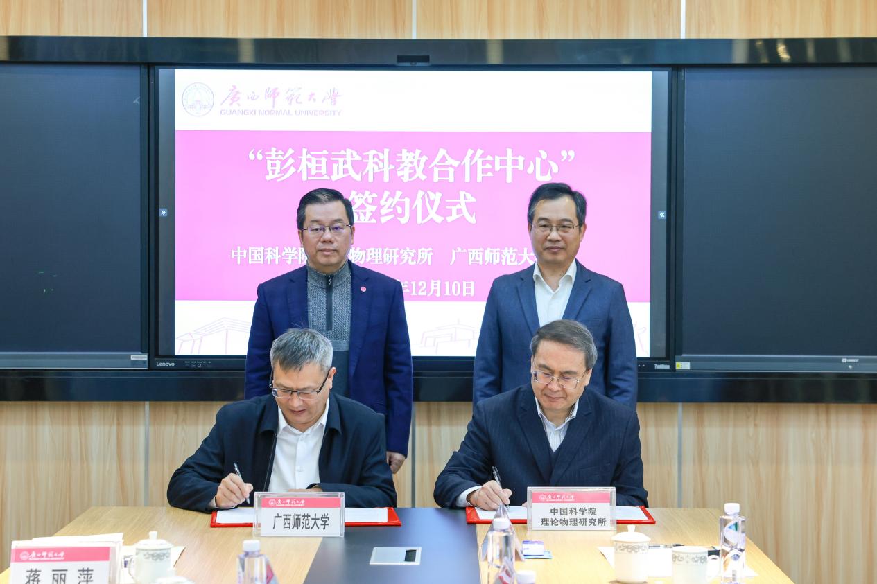 学院新闻12月10日上午,“彭桓武科教合作中心”签约暨揭牌仪式在广西师范大学育才校区胜游体育(SYsports)官方网站入口与技术学院105会议室举行。仪式由广西师范大学党委常委、副校长宋树祥主持。中国科学院理论物理研究所所长周善贵、副所长苏刚,广西师范大学党委书记贺祖斌,中国科学院理论物理研究所、校科技处、胜游体育(SYsports)官方网站入口与技术学院等双方单位负责人、专家与教师代表共同出席。