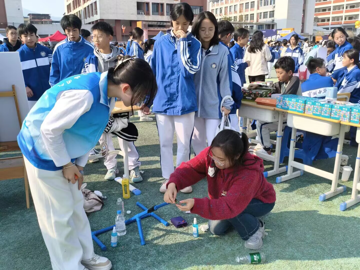本次活动设置多个趣味科普体验项目,覆盖能量转化、大气压强等多类物理知识。蒲公英团队的志愿者们分工协作,既演示科普器材操作,又用通俗语言讲解原理,将抽象物理概念转化为可感可操作的直观体验。现场学生有序围观、踊跃实践,还主动向志愿者提问,互动氛围浓厚。