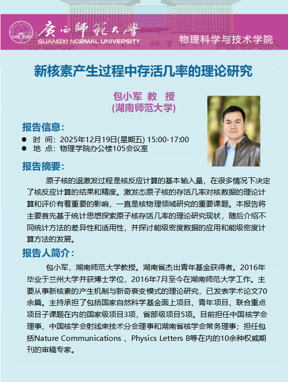 【学术预告】包小军(湖南师范大学):新核素产生过程中存活几率的理论研究