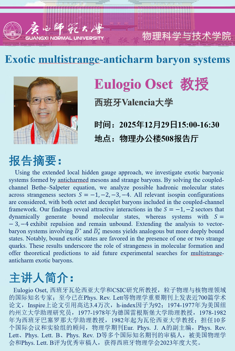 【学术预告】Eulogio Oset(西班牙Valencia大学):Exotic multistrange-anticharm baryon systems