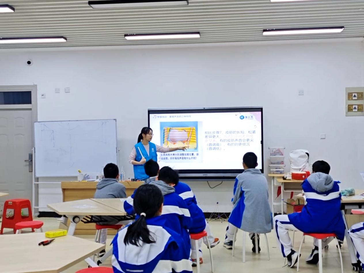 教学过程中,主讲老师结合实验现象讲解振动、振动频率等基础物理原理,同时融入音乐音阶相关概念,帮助学生建立跨学科认知逻辑;课程尾声,主讲老师向学生布置“自制趣味乐器”的实践任务,助力学生深化课上所学内容。