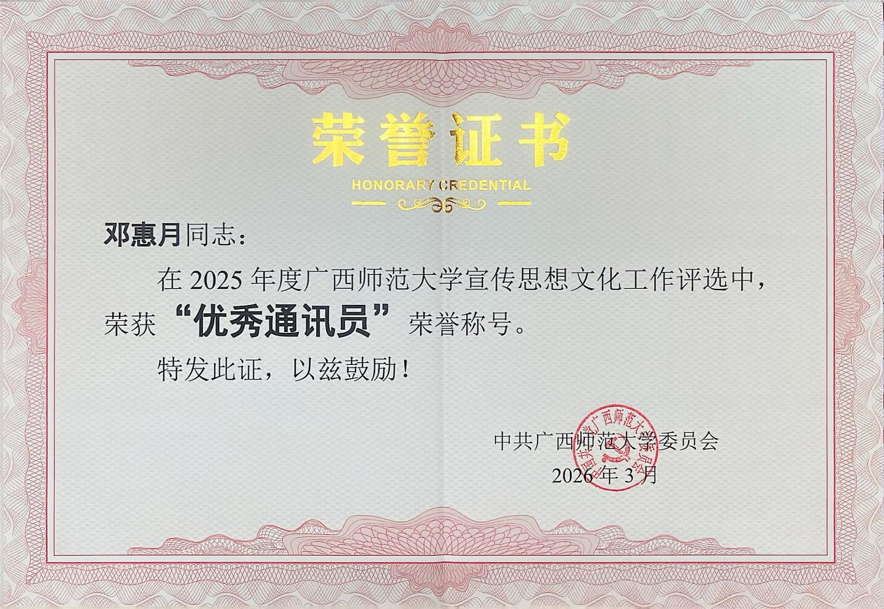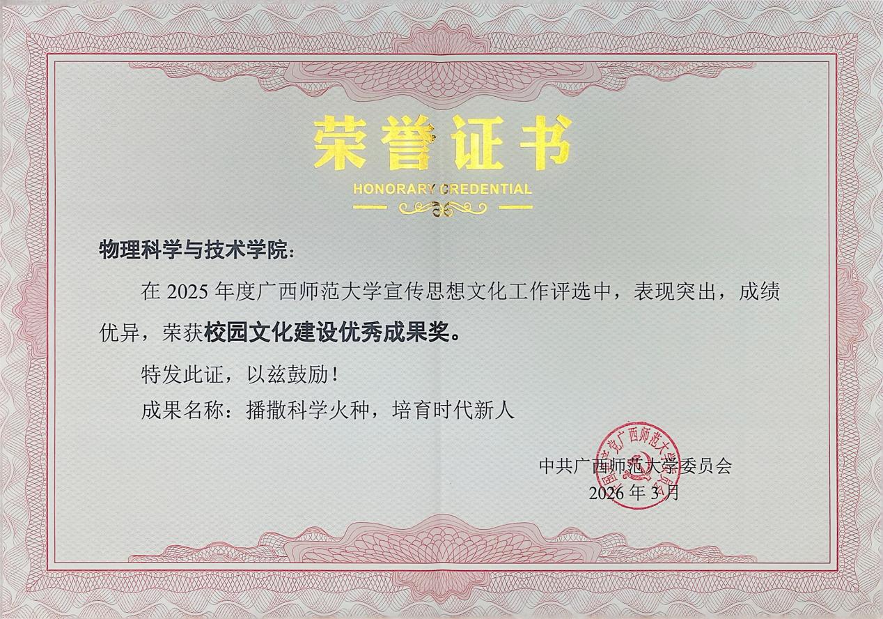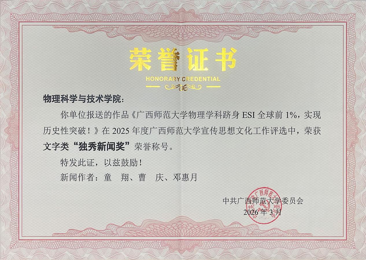 学院新闻近日,我校2025年度全校宣传思想文化工作优秀成果及先进个人评选结果揭晓,其中学院申报的《播撒科学火种,培育时代新人》项目荣获2025年度广西师范大学校园文化建设优秀成果奖;学院童翔老师、曹庆老师、邓惠月老师撰写的《广西师范大学物理学科跻身ESI全球前1%,实现历史性突破》新闻作品荣获2025年度广西师范大学“独秀新闻奖”;同时,学院邓惠月老师凭借出色的宣传工作表现,获评年度“优秀通讯员”称号。这一系列荣誉的取得,充分展现了学院在宣传思想文化工作的显著成效。