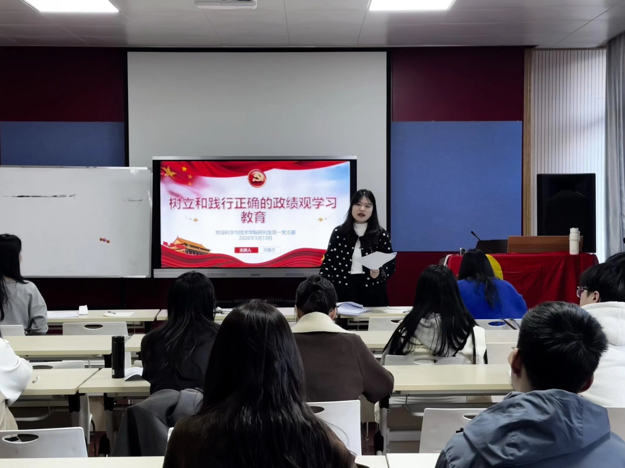 活动中,支部党员李雨泽同志带领全体党员认真学习了政府工作报告核心内容,重点解读了2026年GDP增长目标、宏观政策取向、新质生产力发展、民生保障等关键议题,提高全体党员对国家宏观形势的理解把握能力,进一步统一思想、凝聚共识。随后,支部书记结合习近平总书记关于树立和践行正确政绩观的相关论述,深入阐述了正确政绩观的核心要义与党性要求。她指出,树立和践行正确的政绩观需要明确好“政绩为谁而树”“树什么样的政绩”“靠什么树政绩”三个根本性问题,并且结合研究生实际提出要扣好职业生涯的“第一粒扣子”,把“教育报国、科技报国”作为奋斗目标,坚决反对浮躁虚夸、急功近利的学风,努力做“脚踏实地、知行合一”的追梦人。