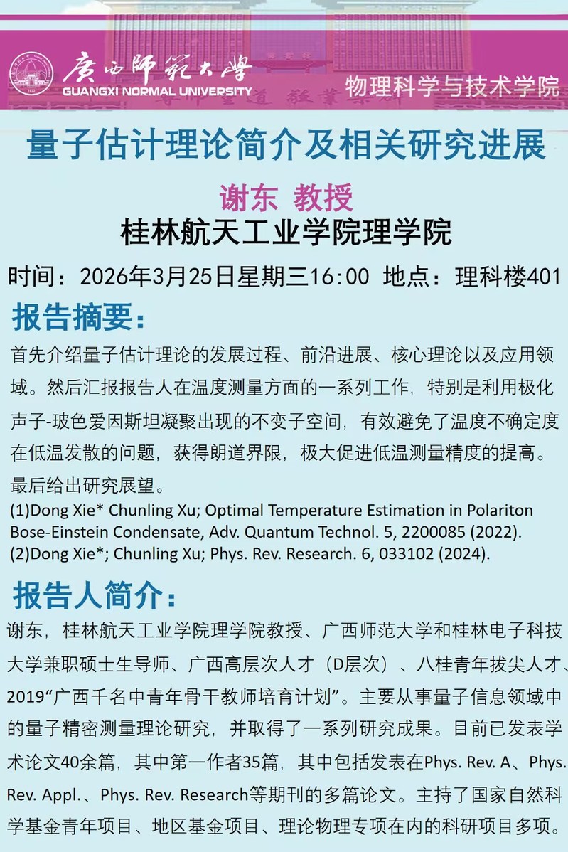 【学术预告】谢东(桂林航天工业学院理学院):量子估计理论简介及相关研究进展