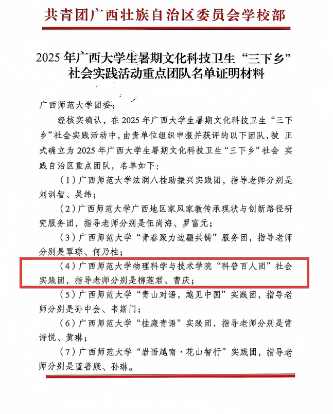 本次评选由共青团广西区委、广西学联联合组织,面向全区高校开展。学院高度重视实践育人工作,积极整合学科资源,组建由柳莲君、曹庆两位老师指导的“科普百人团”。团队立足物理学科优势,围绕“科普助力乡村振兴”主题,深入桂林市及周边乡镇的中小学、社区,开展趣味物理实验演示、科学互动课堂等系列活动,将专业所学转化为服务社会的生动实践,展现了学院学子服务地方、奉献社会的责任担当。