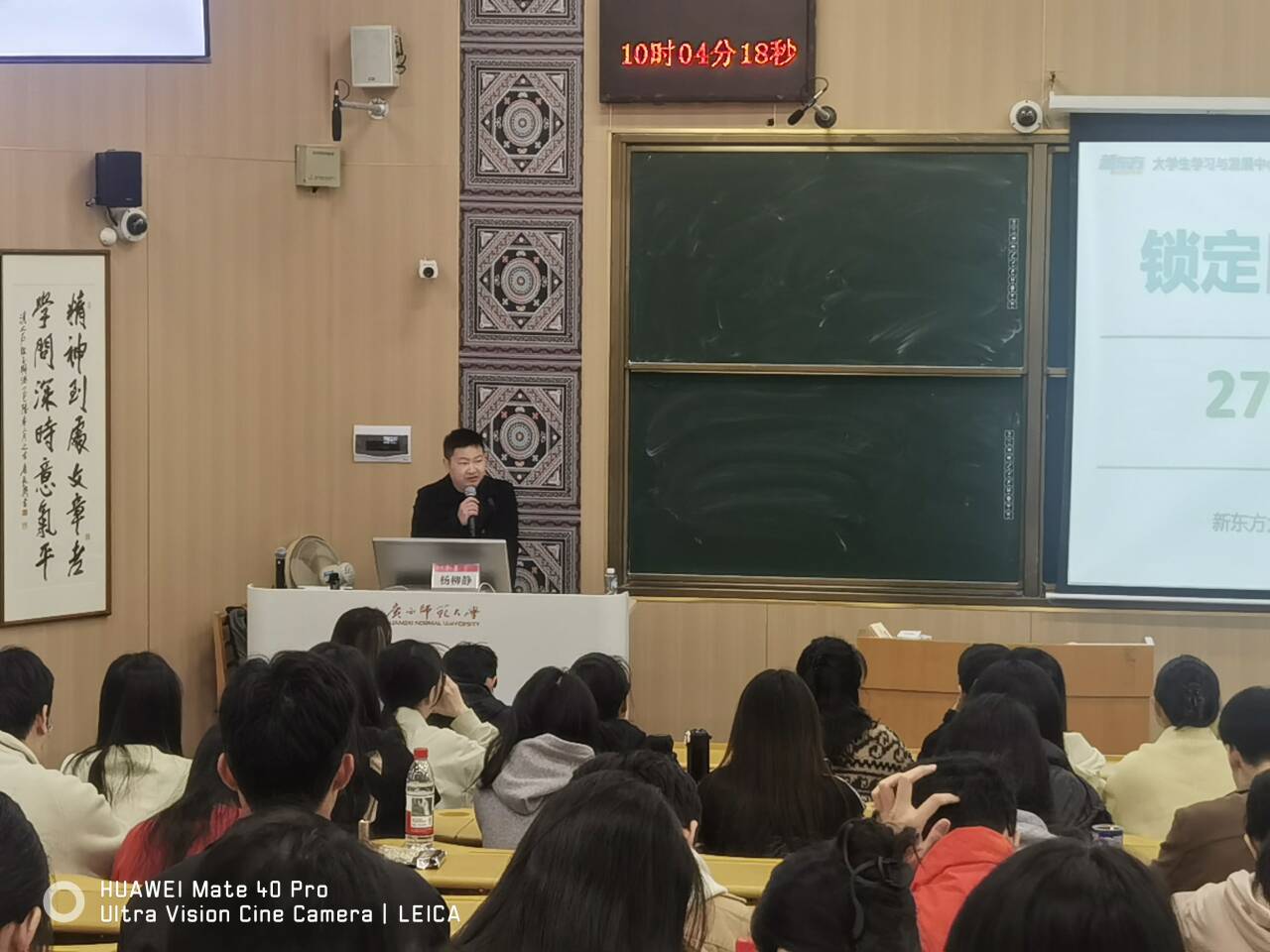 新东方资深考研指导老师杨柳静作专题分享。她围绕院校专业选择、各科复习规划、备考时间管理、答题技巧及心态调整等方面,结合多年教学与辅导经验进行了系统讲解,并针对备考过程中的常见误区、重难点突破及阶段性复习安排等问题提出了切实可行的建议,帮助学生厘清复习思路、掌握科学方法。