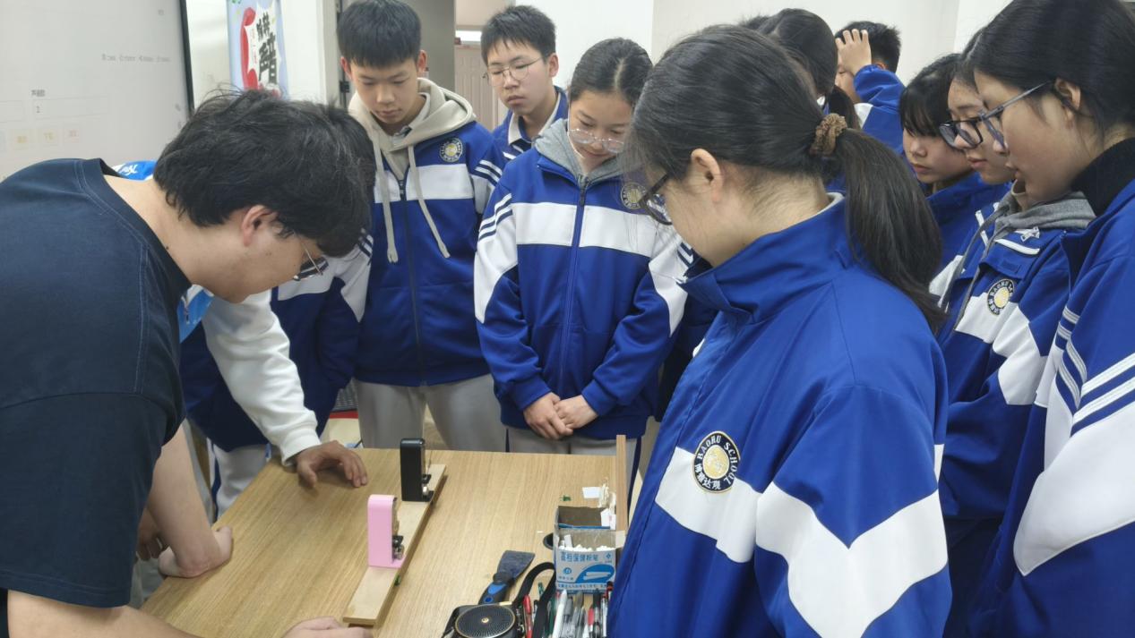 课堂上,团队成员以 “音调” 为引,系统讲解了频率的定义、单位及物理意义,通过分组听音实验,让同学们直观感受人耳听觉频率范围(20Hz~20000Hz),认识次声波、可听声与超声波的区别,并结合雷达定位、B 超检查等实例,科普不同声波在生活与科技中的应用。在实验环节,团队利用音响、连通水桶的管子和可调频手机,演示了 “水流静止” 的神奇现象:当音响振动频率与手机拍摄帧数一致时,结合视觉暂留与频闪效应,流动的水在镜头中呈现出 “时间停止” 的视觉效果,让同学们在动手操作中理解共振与频率的核心原理。