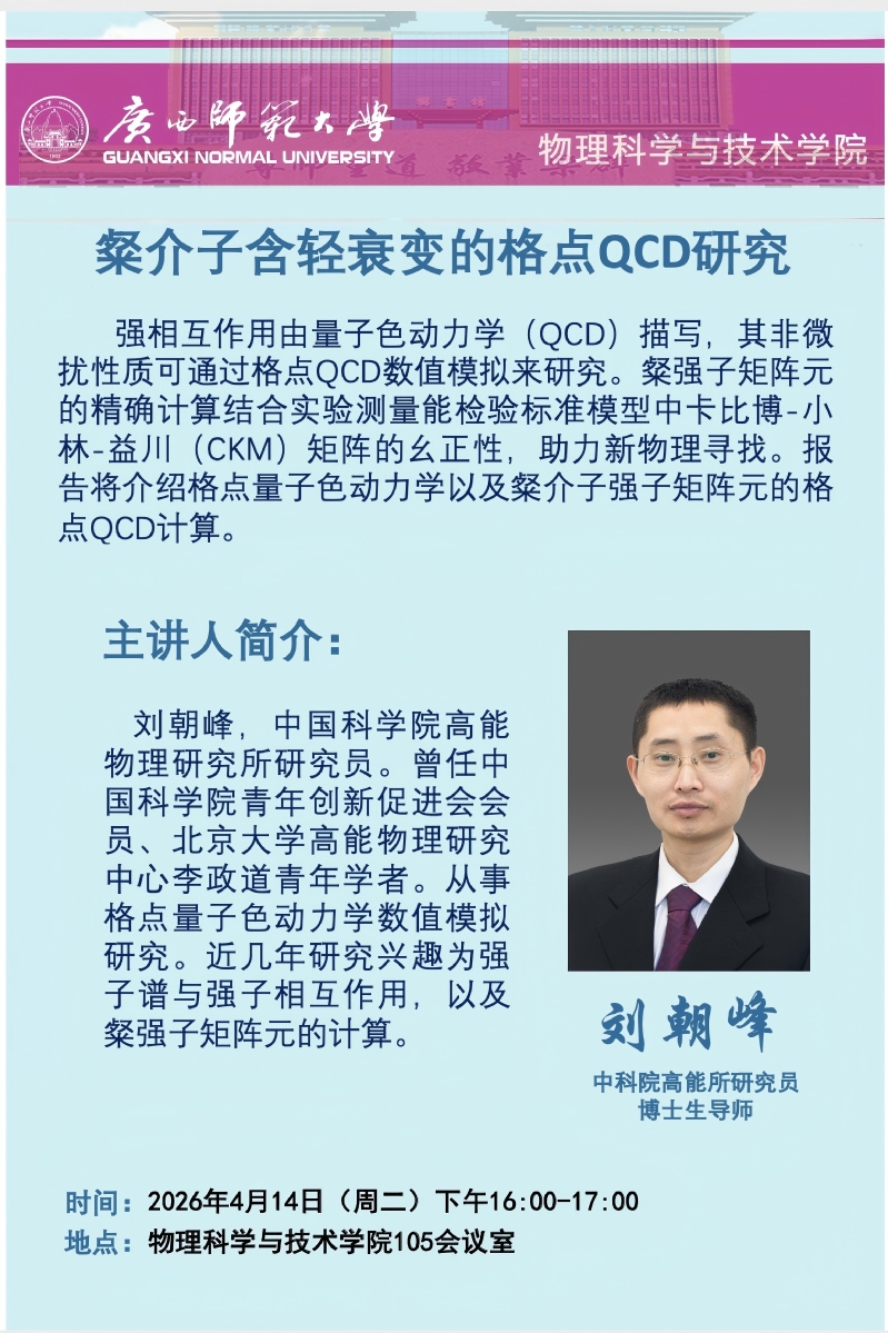 【学术预告】刘朝峰(中国科学院高能物理研究所):粲介子含轻衰变的格点QCD研究