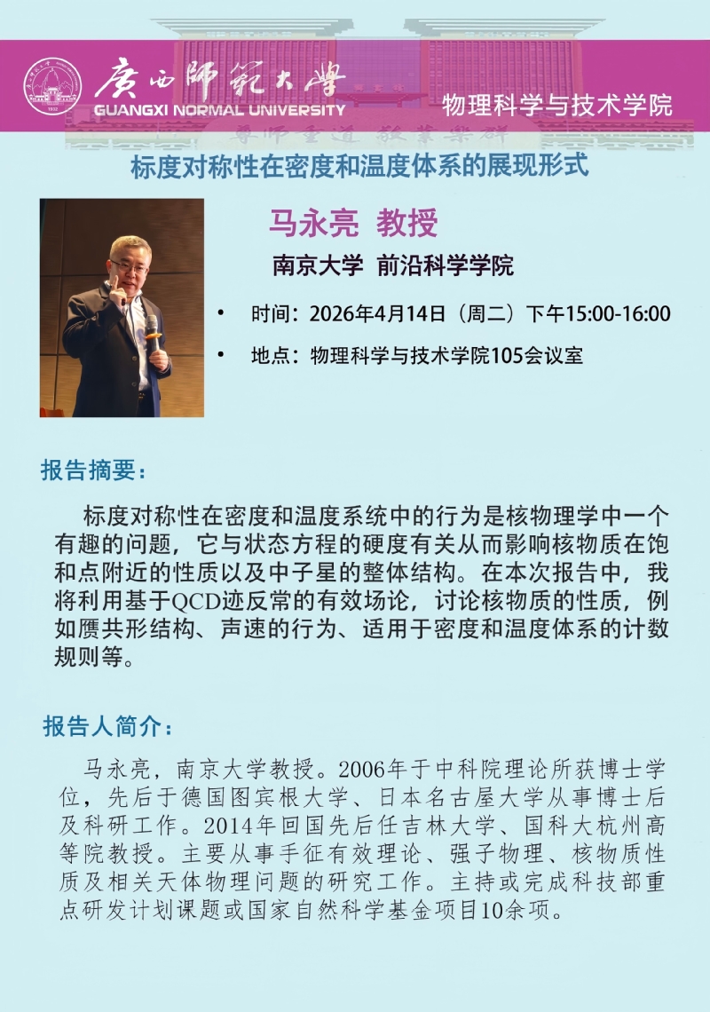 【学术预告】马永亮(南京大学):标度对称性在密度和温度体系的展现形式